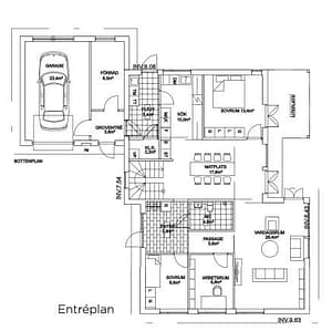 Här har man gott om plats med upp till sju rum och kök. Både vardagsrum och kök är rejält tilltagna i storlek. Den oregelbundna formen består av en tvåplans- och en enplansdel med förhöjd takhöjd. Matsalen får ljus genom trapphuset samt de stora fönsterpartierna mot baksidan där en öppning är upptagen till övervåningen.